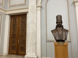 Tijdens onze tour van vijftig minuten zagen we ongeveer 3% van het hele paleis. We begonnen in een brede, lange hal, bekleed met blauwgroen tapijt met gouden randen. De zijpanelen waren pastelblauw, met crèmekleurige bogen, randen en uitsnijdingen. Er stonden statige borstbeelden op bruinhouten sokkels verspreid langs de wanden van de hal. Het plafond had een lichte buiging, in dezelfde pastelblauwe kleur met witgouden bogen erop. Langzaam begonnen de grootsheid van dit paleis tot ons door te dringen.